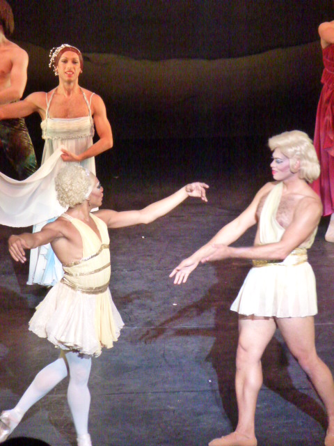 Le ballet suivant, comme souvent, s’adresse d’ailleurs plutôt aux balletomanes. Dimanche soir, Go For Barocco était un délice pour quiconque avait vu le programme Balanchine à l’Opéra. Il pastiche en tout premier lieu le Concerto Barocco de Mr B. Sur le concerto pour deux violons de Bach, Balanchine avait crée un ballet où les deux ballerines principales se partageaient les parties du premier et du second violon. Mais avec les Trocks, les références ne s’arrêtent pas là : il y a du Sérénade, de la Symphonie en Ut, de l’Apollon et même du Agon dans ce ballet. Voir les emmêlements du musagète, retournés comme des crêpes, dos au public, c’est risquer de tomber de son siège à force de rire même quand on n’est pas un initié.