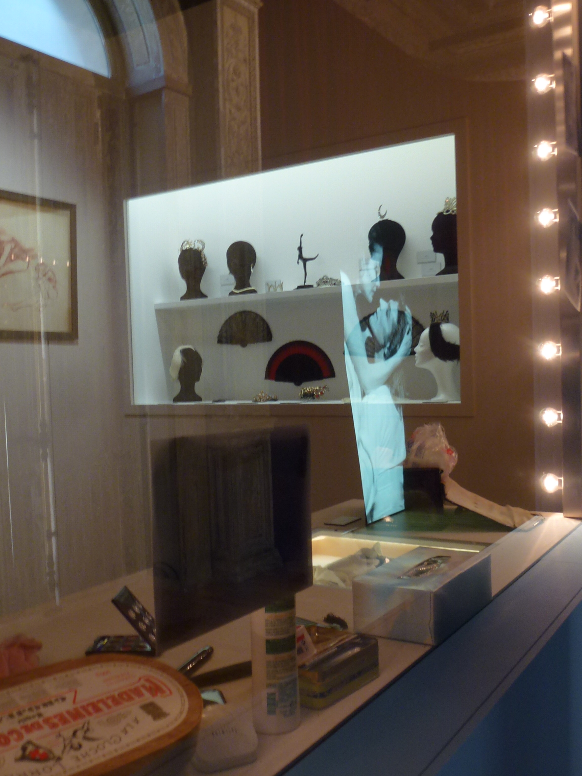 P1030883Sous le dôme de verre de l’hôtel particulier devenu un temps une banque, les costumes placés en arc de cercle autour d’un podium où trône un tutu de « Giselle-1er acte » sont comme soulignés par des piliers de carton-pâte. Les affiches et autres artefacts plus modestes (photographies, programmes) sont occultés par cette mise en scène d’accueil. Sur un rideau de fil est projetée, fantomatique, une Mort du cygne tandis qu’on distingue au bout d’un moment les relevés d’une Odette au deuxième acte du Lac sur la coupole de verre et de béton. Et on s’approche alors des costumes, palimpsestes de la danseuse qui a cessé d’appartenir à la troupe de l’Opéra après sa prise de rôle dans Raymonda, il y a bientôt trente ans : on s’attarde sur les bustiers qui surmontent les corolles. Ils ont abrité un buste court et droit. À l’usure des décorations de perles et de paillettes, on voit que les partenaires de la ballerine posaient les mains assez hautes sur le buste, juste en dessous de la naissance de la poitrine plutôt qu’au bas de la taille.
