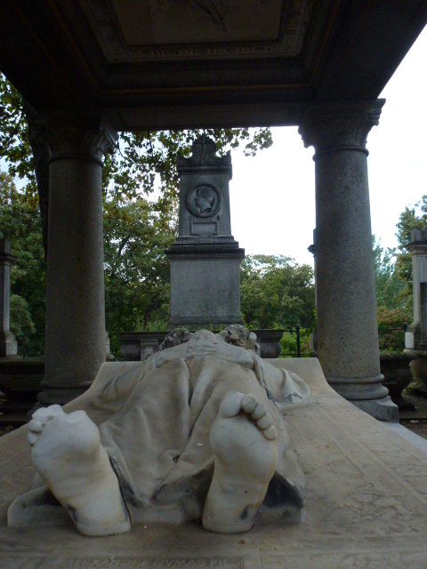 Fenella (changeant de sujet) : oh regardez, how cute ! Quelqu’un a repassé les lettres de l’épitaphe à la peinture dorée… Well, it’s ugly though…. (lisant) Ici repose Alphonsine Plessis, née le 15 janvier 1824, décédée le 3 février 1847. De profundis…