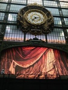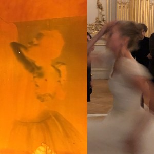 À ce stade, on a compris qu’on n’est pas convié à une réunion de partage heureux. Cela se confirme dans la salle des fêtes du premier étage où, pourtant, la proposition chorégraphique est la plus substantielle. Trois ballerines en costume romantique blanc (Mesdemoiselles Hilaire – dense –, Osmont – intense – et Viikinkoski) traversent la salle et investissement l’une des six alvéoles délimitées par les colonnes en imposte. Nicolas Paul leur a concocté une chorégraphie où s’imbriquent, à une vitesse toujours plus rapide, les positions caractéristiques des danseuses croquées et photographiées par Degas. Les mouvements ont une puissance toute moderne. Les ballerines, pieds-nus, farouchement ancrées dans le sol, percent parfois la foule pour aller d’une alvéole à une autre. On apprécie la mise en espace (à un moment les danseuses ouvrent théâtralement les trois portes dorées du salon qui révèlent des couloirs étrangement impersonnels). On goûte beaucoup moins le fond. Le salon d’apparat de la gare d’Orsay n’est pas sans évoquer le foyer de la danse de l’Opéra de Paris. On n’avait pas nécessairement envie d’être portraituré en membre du public prédateur. Ce que l’exposition elle-même avait élégamment évité est réintroduit ici de manière pataude par les danseurs de l’Opéra. Nicolas Paul reste néanmoins un talent chorégraphique à suivre.
