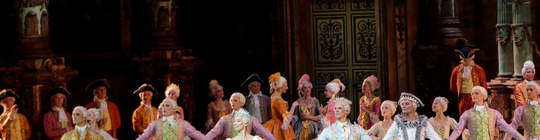 Le plus dommageable reste néanmoins le début du troisième acte. Celui de la production actuelle offre un spectaculaire lever de rideau. Invariablement la salle éclate en applaudissements devant les jaunes et orangées des costumes féminins, les bleus Nattier des redingotes fin XVIIIe des hommes (Franca Squarciapino) sous l’éclat des multiples lustres de cristal. Et puis les danseurs commencent à bouger et le soufflé retombe.