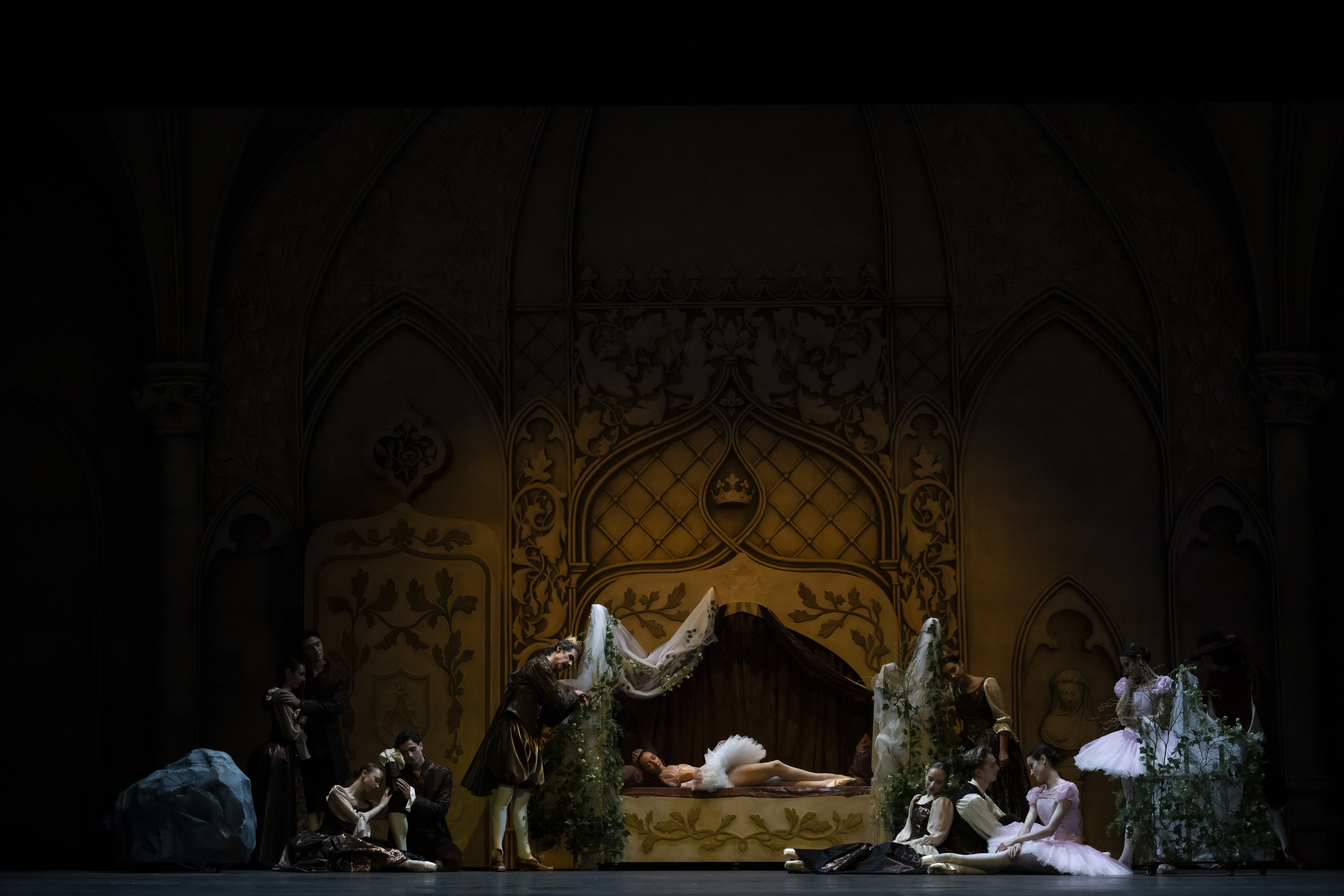 On le regrette parfois. Olivia Lindon, fée en jaune, aurait très bien pu exécuter la variation originale de « canari », suffisamment courte et mignarde pour plaire aux enfants. A l’acte 1, si on apprécie au passage la composition des trois princes en concurrence, tout particulièrement Nicolas Rombaut qui a toujours eu du flair dans les rôles comiques, on trouve qu’il n’y a peut-être pas assez d’Adage à la rose dans l’Adage à la rose. La princesse Aurore se retrouve un peu abruptement à faire les équilibres finaux avec promenade quand elle n’a pas exécuté les statiques du début de la variation. La jeune danseuse, Miyu Kawamoto a donc du mal à les tenir mais se rattrape bien avec le dernier. De même, la deuxième variation d’Aurore traditionnelle et la Tarentule auraient pu s’intégrer dans les décors au lieu d’être réécrites d’une manière qui évoque plus Coppélia et ses petites amies que La Belle.