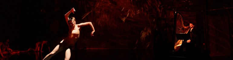 La scénographie (Nanine Linning et Christa Beland) est, on l’a compris, impressionnante mais elle est également soutenue par la dramaturgie qui orchestre la longue descente aux enfers des humains. La harpiste, voyageant sur une plateforme à roulettes, sert de fil d’Ariane, tour à tour apaisante, mystérieuse, divine ou vengeresse. Ses pizzicati instrumentaux déchirent visuellement les trois murs de scène par des clusters blancs. Elle se transforme en bourreau dans une scène saisissante et juste ce qu’il faut intolérable où les danseurs, accrochés sur des picots d’escalade à jardin, ressemblent à des crucifiés sur quelque Golgotha. La scène, intense et assourdissante, stoppe net au moment où on commence à désirer se lever et partir.