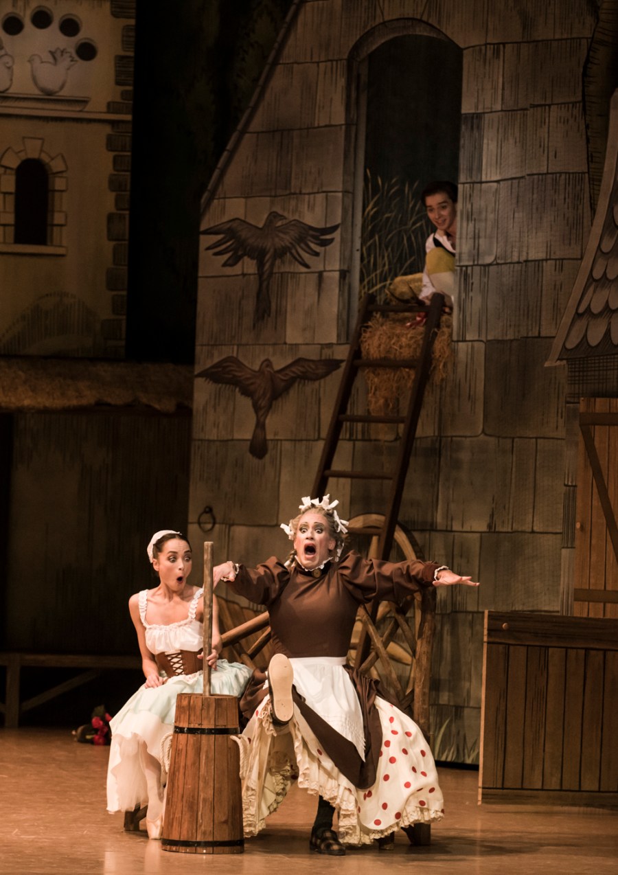 La Fille mal gardée. Lise (Vanessa Feuillate), mère Simone (Alvaro Rodriguez Pinera) et Colas (Oleg Rogachev). Photographie Julien Benhamou