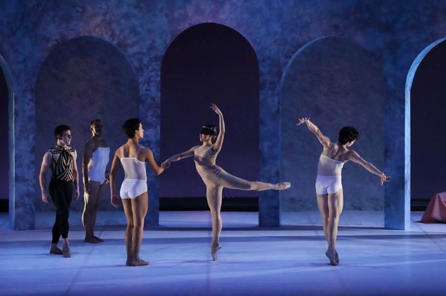 La Belle au bois dormant. Alessandra de Maria (la Belle) David Claisse (le prince) et les prétendants. Adage à la rose. Photographie Stéphane Bellocq.