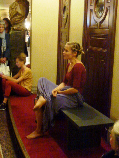 Myriam Kamionka on a prop bench by the premières loges…