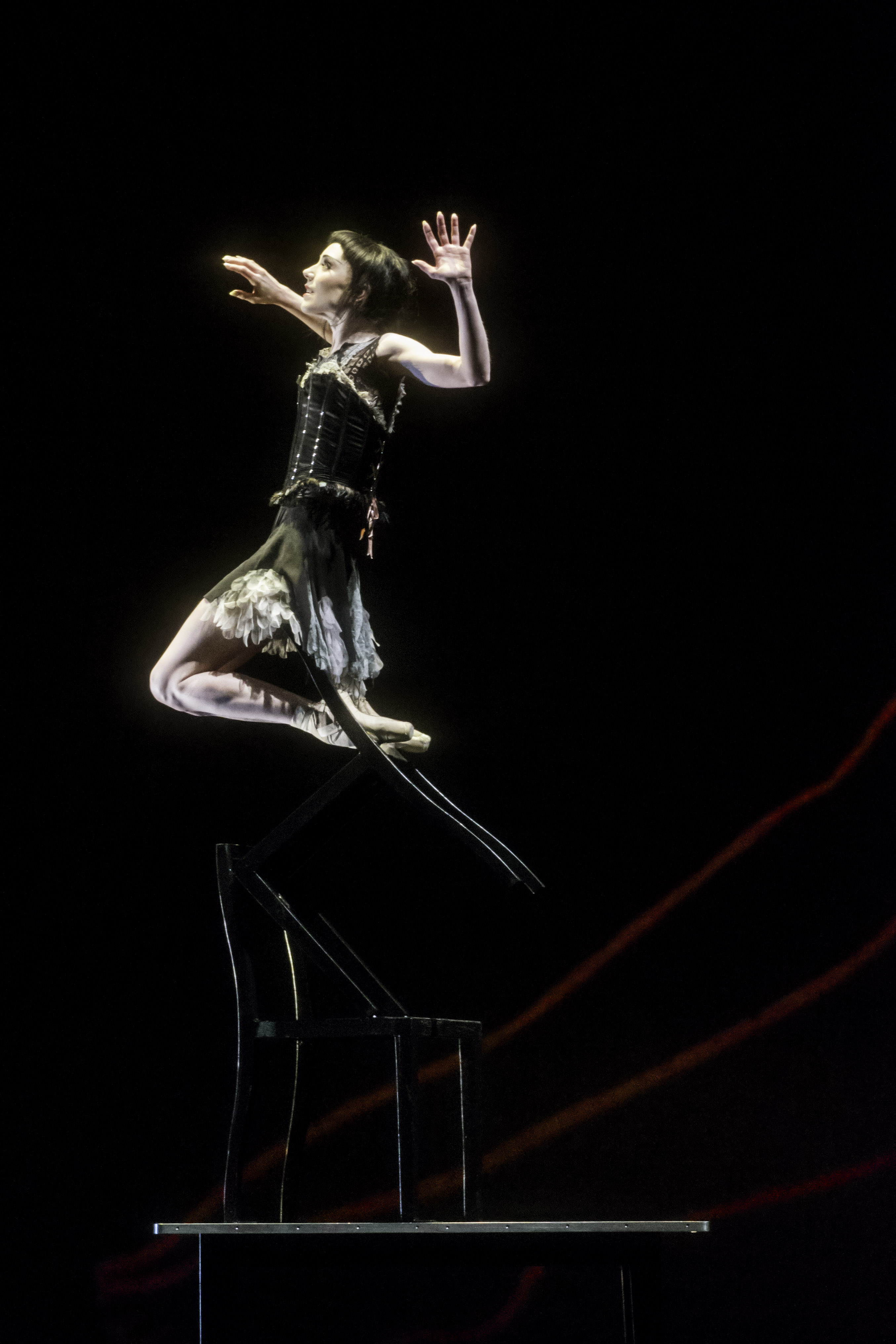 Sarah Lamb empile les chaises dans Raven Girl – Photo Johan Persson, courtesy of ROH