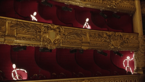 A clever set that leaves you puzzled, to start with. The outlines of wooden door frames are highlighted by led lights. The frames are attached to each other and can be pulled out like accordions and wheeled around or reshaped into one square outline as clouds of dried ice float by. I thought of Olafur Eliasson’s “Inside the Horizon,” that unfolding series of slivered reflections at the Louis Vuitton Foundation. I began to recall the many times Jean Cocteau made characters walk through mirrors in his films. My seatmate – after we made a pact that we would both not put our noses into the program beforehand – concentrated hard and said she saw people trying to step away from their cellphones. A French friend had seen French windows.