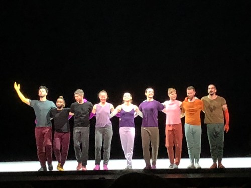 L’élastique Rauf Yasit offre encore d’autres moments mémorables. Son duo « Castor et Pollux » avec Roderik George, où chaque enroulement de l’un entraîne une action de son comparse, pour peu qu’un de ses membres se mette dans le prolongement d’un membre de l’autre, évoque l’alignement des planètes ou une mystérieuse constellation. Au milieu des joliesses néo-néo postclassiques, Yasit accomplit aussi un très beau duo avec Gjoka. Les ports de bras aux gants colorés enflamment la cage de scène. A un moment, les bras très en anses de Rauf RubberLegzs Yasit évoquent un trou noir absorbant les étoiles filantes figurées par les bras gantés de Brigel Gjoka. Ce duo qui contraste avec les autres évolutions des danseurs n’est pas sans faire référence aux hiérarchies anciennes de la danse baroque entre danse noble, demi-caractère et caractère. Les interactions des deux danseurs font penser un peu à l’acte deux d’Ariane à Naxos où Zerbinette et sa joyeuse compagnie commentent sur un mode de commedia dell’arte la tragédie grecque. Le pas de deux de Yasit avec une partenaire féminine, où Forsythe laisse le danseur-chorégraphe déployer son propre vocabulaire acrobatique, n’a pas la même poésie. Il faut se concentrer pour voir les très belles évolutions de sa partenaire.
