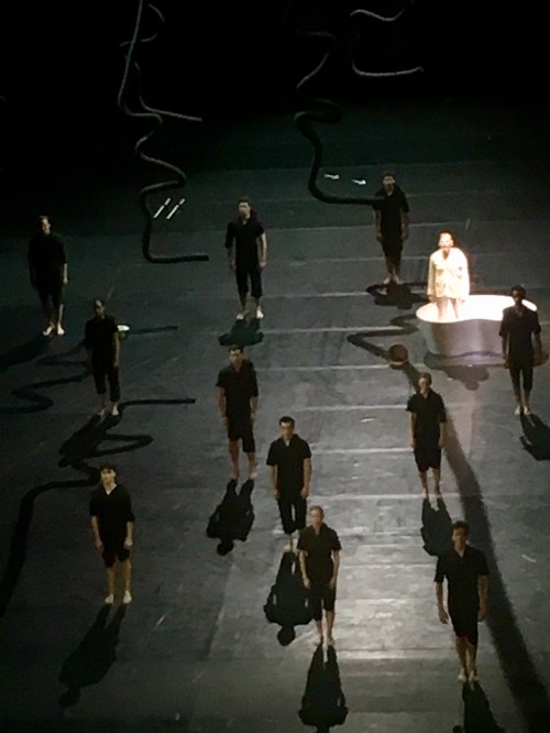 Le Boléro, servi sans baisser de rideau après Another Place, à l’avantage de sortir un peu de l’attendu. Un vieillard habillé de blanc et coiffé d’un chapeau à large bords (Niklas Ek) remplit imperturbablement une baignoire de zinc avec son sceau d’eau, incarnant par là même l’ostinato de la partition de Ravel, tandis que de gros macaronis de nage tortillés (vaguement en forme de profil humain) descendent des cintres et dessinent, par le biais des éclairages, des motifs surréalistes au sol. La vingtaine de danseurs habillés de costumes noirs à capuche apparaît par groupes variés (la compagnie entière, en duos ou par doubles quintettes) et égrène le vocabulaire technique du chorégraphe sans l’appareil psychanalytique qui l’accompagne habituellement. A la fin, certains danseurs accomplissent de micro-agressions sur la personne du petit baigneur qui continue de remplir, imperturbable, sa cuve de Zinc. Pour le Final, l’ensemble de la compagnie gît au sol. Le vieil homme se plonge alors à la renverse dans son bain.